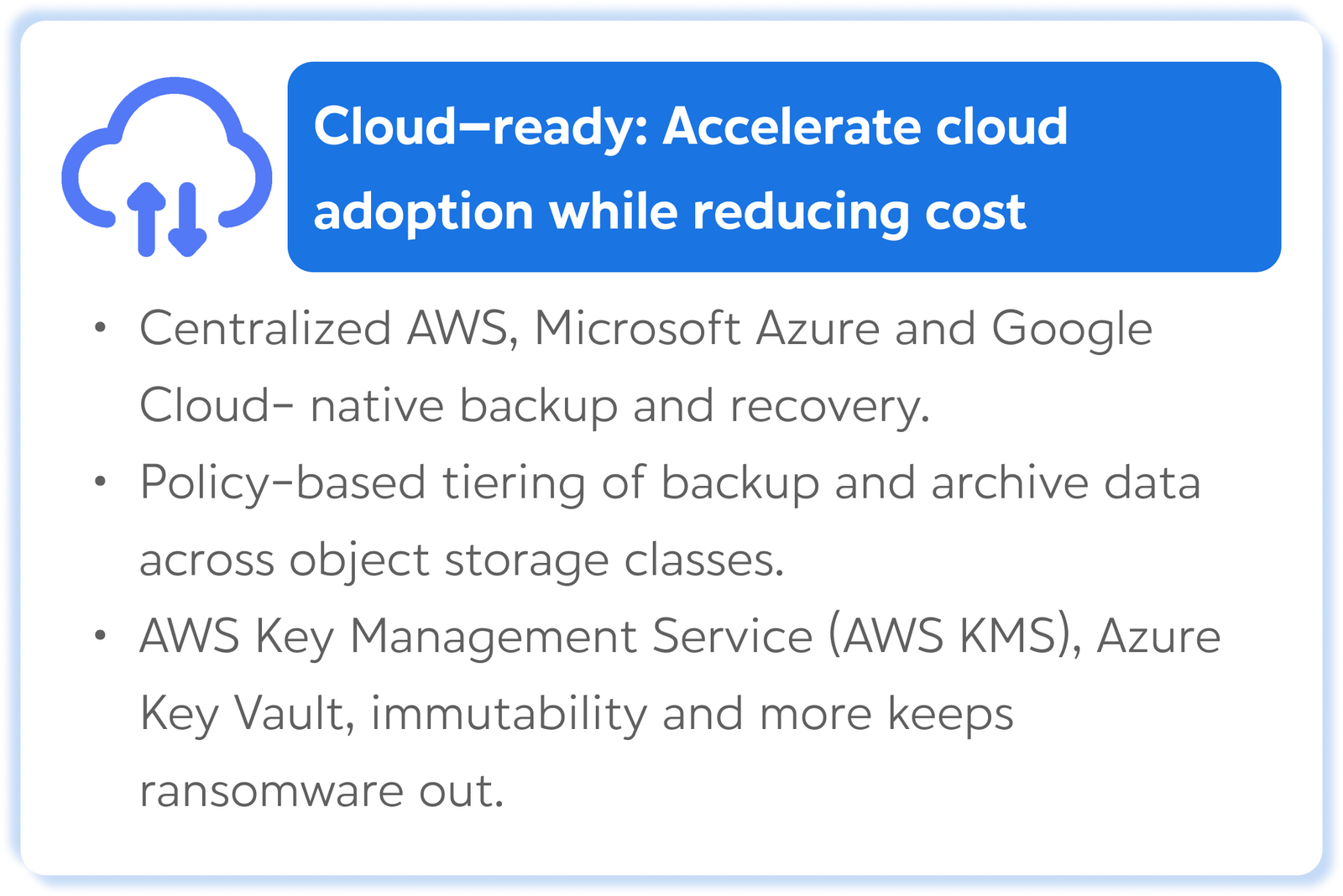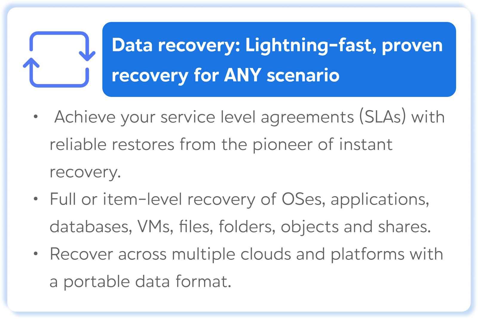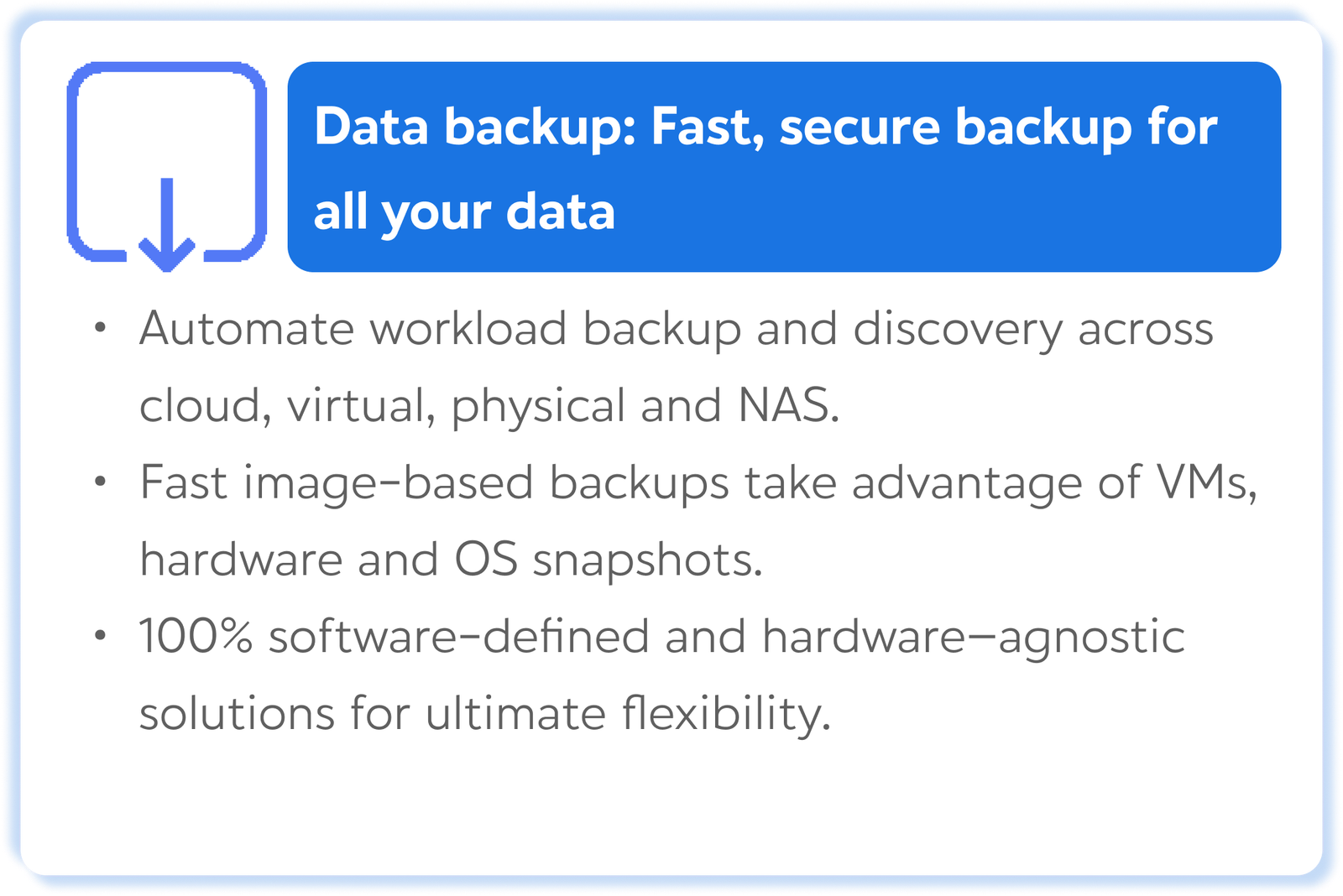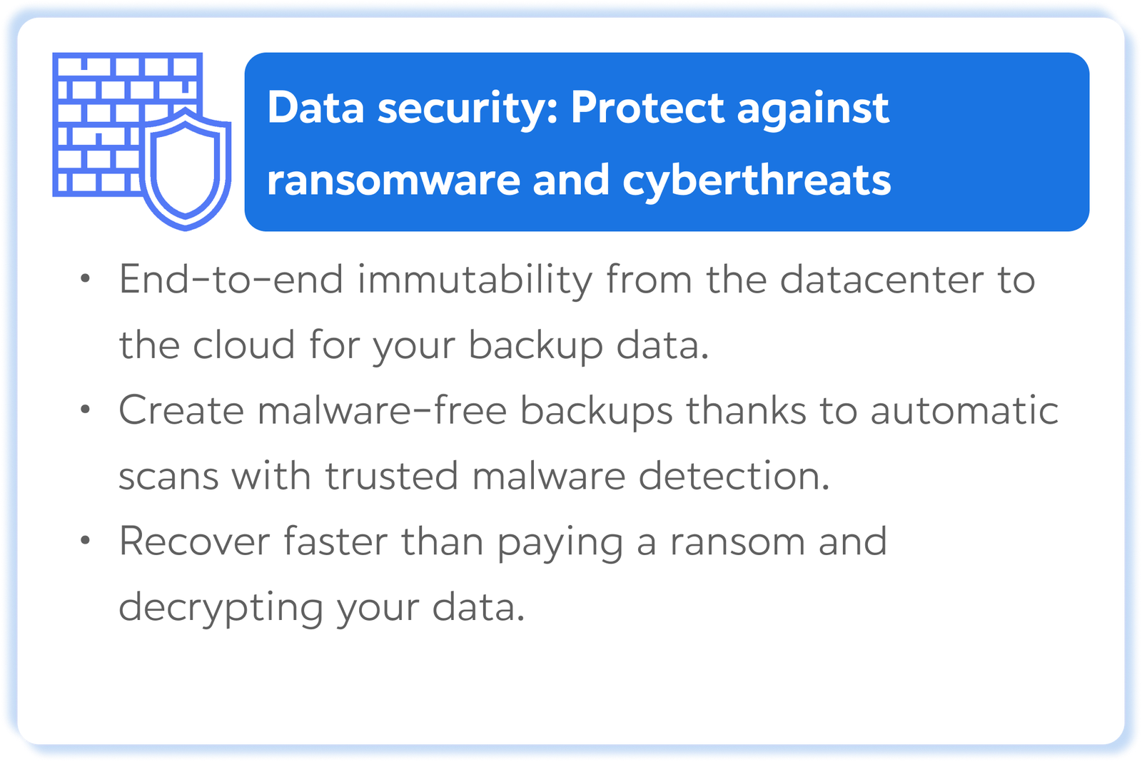 Backup & Replication is the single backup, recovery and data security solution for all your workloads both on-premises and in the cloud. As the foundation of our Platform, our Backup & Replication solutions deliver simple, flexible, reliable and powerful data protection. Eliminate downtime with instant recovery and stay safe from cyberthreats with native immutability and tested backups, all from one software-defined, hardware-agnostic solution